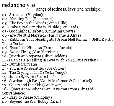 Through An Emotional Peep-Hole Though TAEPHs are a subset of YWGTs, I distinguish between them because the former may just be the finest sort of Mix CD there is. I know, I know: how could a disc of "melancholy songs" be preferable to an album of "live cuts from the early 90s, where grunge bands ironically cover disco hits"? Well, it is. Over the long-run, I've found that those mixes composed from a particular emotional place, with a particular outlook, vibe, feel or heartbeat, are the ones which last. Their proof is in the pudding: it's the mixes with feeling that I put on, late at night, when I want to listen close to something really good. Sometimes these anthologies are abstract - diverse, squawking-then-silent collections of songs - but always there's a cohesive sensation in the words and sounds that are sung. These are the sorts of albums that can communicate love. They are poetry at its best: reducing a feeling, a state-of-mind, a je ne sais quoi to its very essence... binding its nuances and fragrances with music and lyrics, guitar, drums or violin. (Personal examples: sad songs and melancholy-o.)