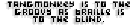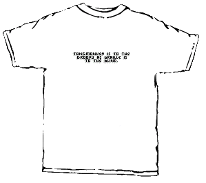 We are now offering a brand-new, super-fantastic shirt design which can be ordered today for delivery before they hit the runways of Paris and Milan in fall 2001. Even if you've already got one of our "vintage" Tangmonkey.com logo-shirts you'll want to update your look with the latest Tangmonkey apparel, now featuring one of ten optional back-slogans!